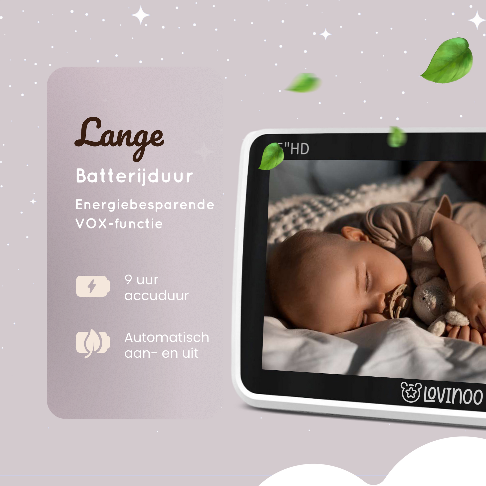 Dankzij de slimme VOX-modus springt het scherm alleen aan wanneer er geluid wordt gedetecteerd. In combinatie met de eco-modus blijft de babyfoon extra energiezuinig, en gaat de krachtige batterij tot wel 9 uur mee zonder tussentijds opladen.