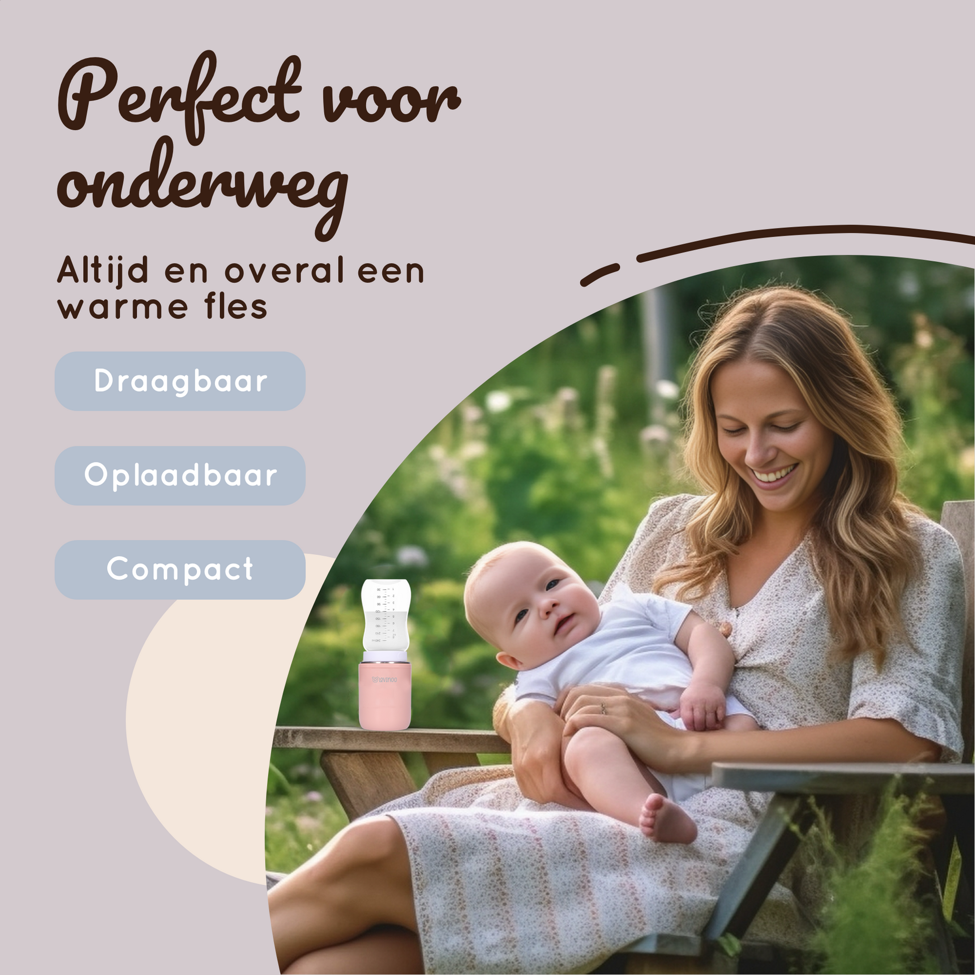 Op een volle accu kunt u de fles tot 14 keer verwarmen — ideaal voor onderweg, op reis, tijdens lange dagen buiten of nachtvoedingen in huis. U bent volledig onafhankelijk van warm water, thermosflessen of stopcontacten.