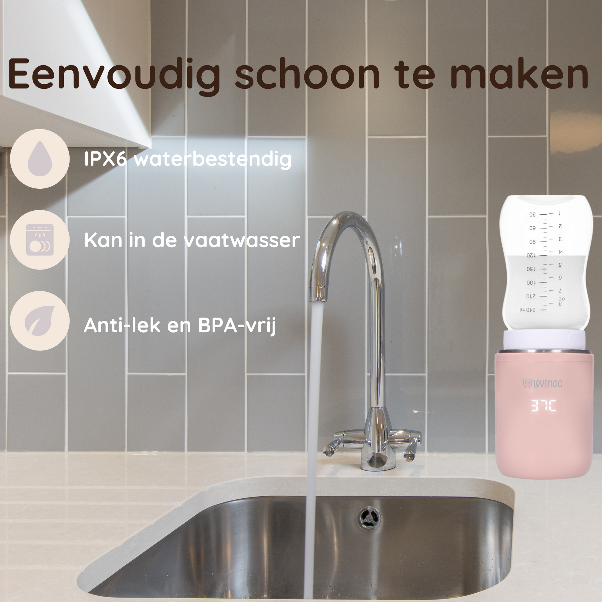 Ja, de flessenwarmer heeft een IPX6-waterbestendigheidsclassificatie en kan tegen vocht. Hierdoor is hij veilig en gemakkelijk schoon te maken.